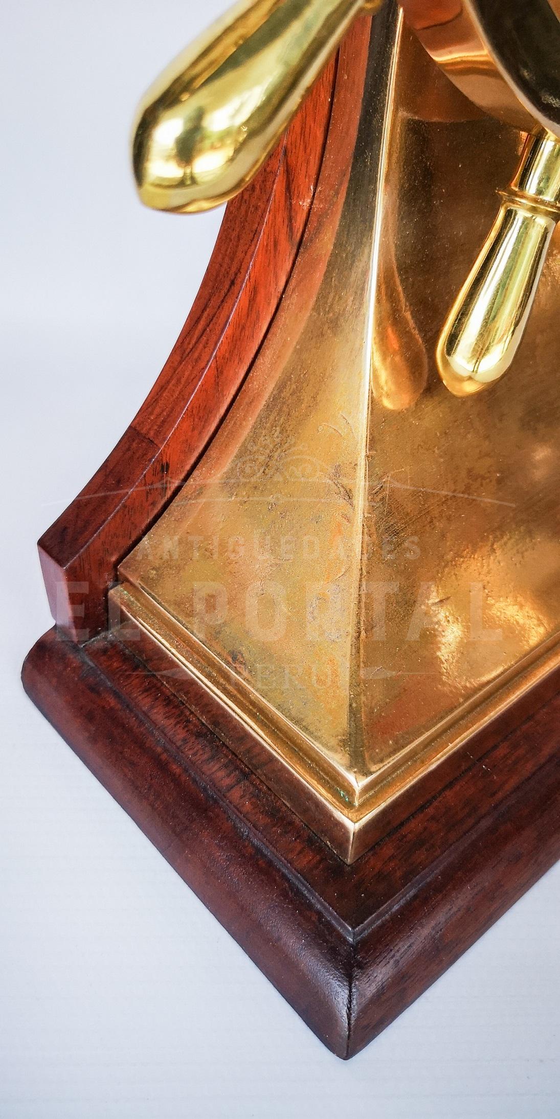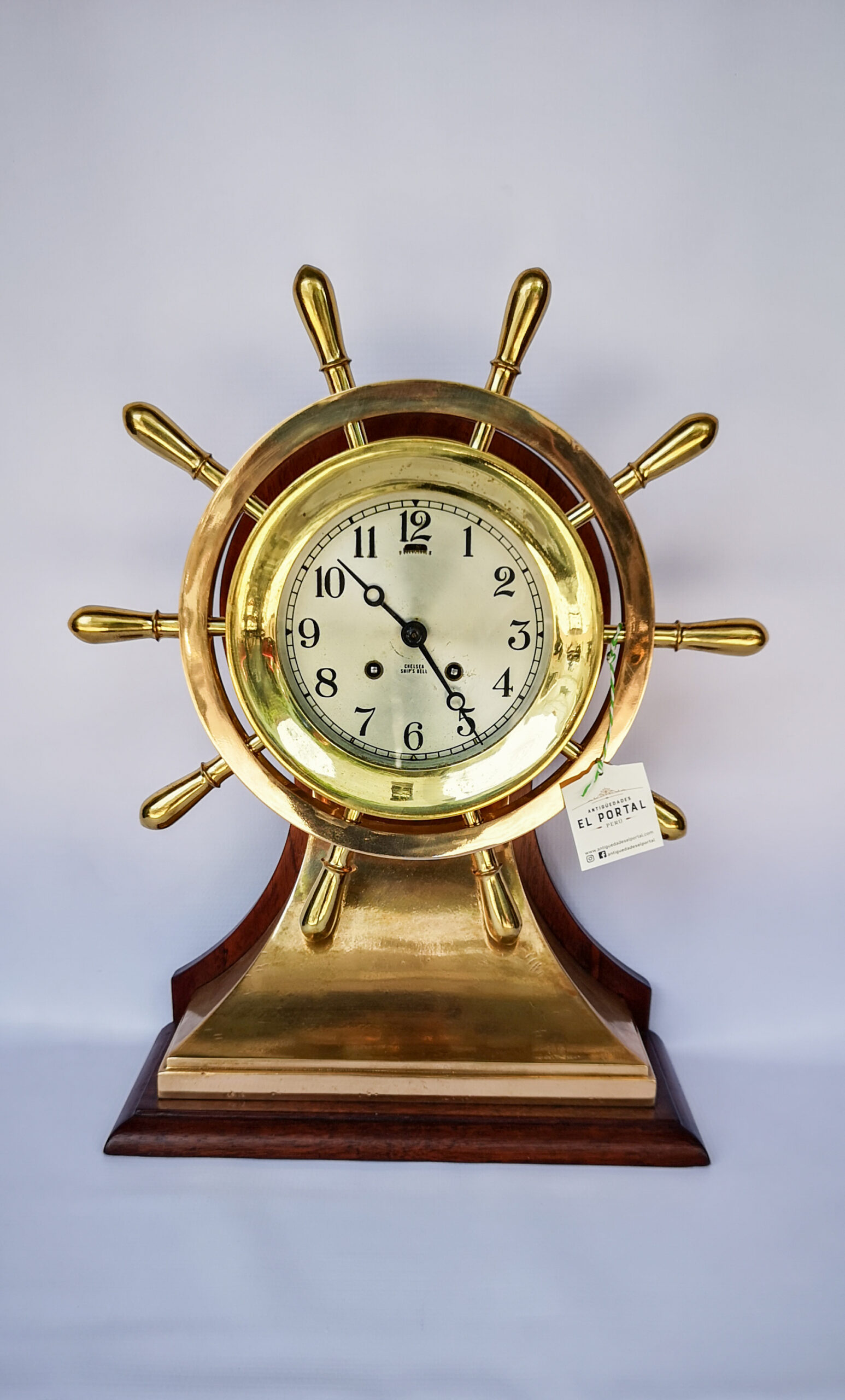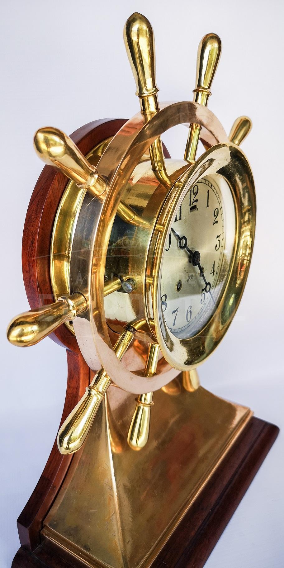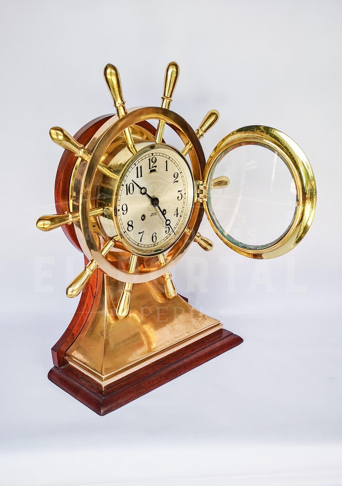 Reloj de barco marca Chelsea en forma de timón, de bronce con madera de caoba de los años 1945-1950 aproximadamente. Alto 44 cm Ancho base 31 cm Diámetro de timón 37 cm Fondo 14 cm